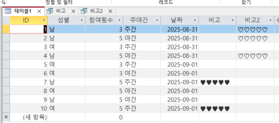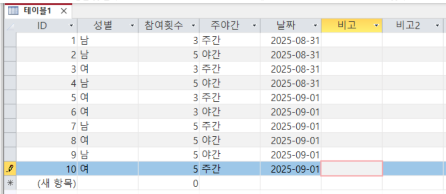문제1. 테이블1에서 참여횟수와 주야간 필드를 이용해서, 주야간의 구분이 주간이고